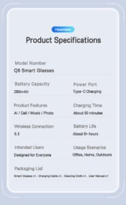 Revolutionize your daily capture with the Q6 Smart Glasses Camera! Featuring an 8MP AI-powered lens, it delivers crystal-clear photos and videos. Lightweight, stylish, and voice-activated, it’s perfect for vlogging, sports, and hands-free convenience. Trusted by thousands worldwide.